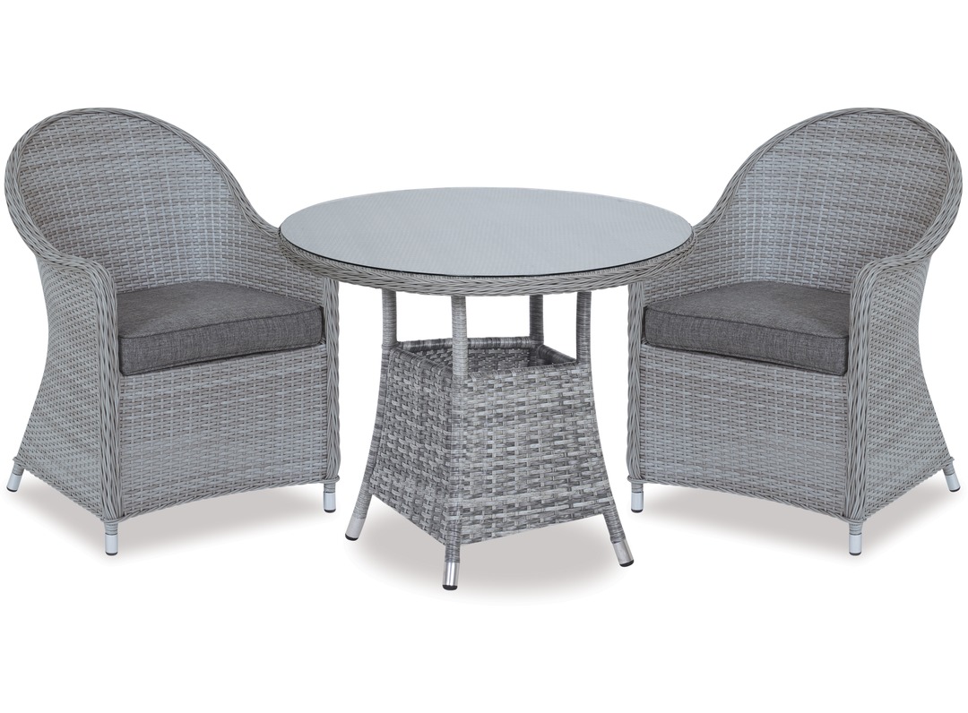 The Baja 740 round table and Cabo chairs are perfect for a small balcony or outdoor area. The woven wicker grey wash finish is both stylish and durable and will complement many exteriors. The Baja 740 table and Cabo chairs are a great option for casual outdoor dining.