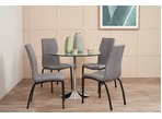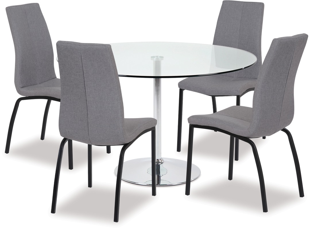 The Becky dining table is modern and stylish and offers great value and design. Featuring a clear glass top and chrome base, this table comfortably seats 4 people and is perfect for an apartment or small home living. The Asama dining chair is designed to captivate those who love clean and simple lines. Featuring curved back legs and fully upholstered seat and back.