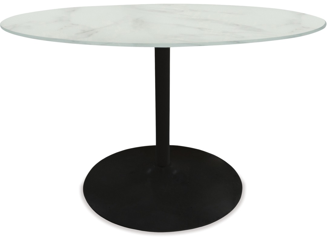 The Tarifa dining table is modern and stylish and offers great value and design. Featuring a white marble print glass top and a black metal base. The Tarifa dining table comfortably seats 4 people and is perfect for an apartment or small home living.