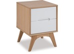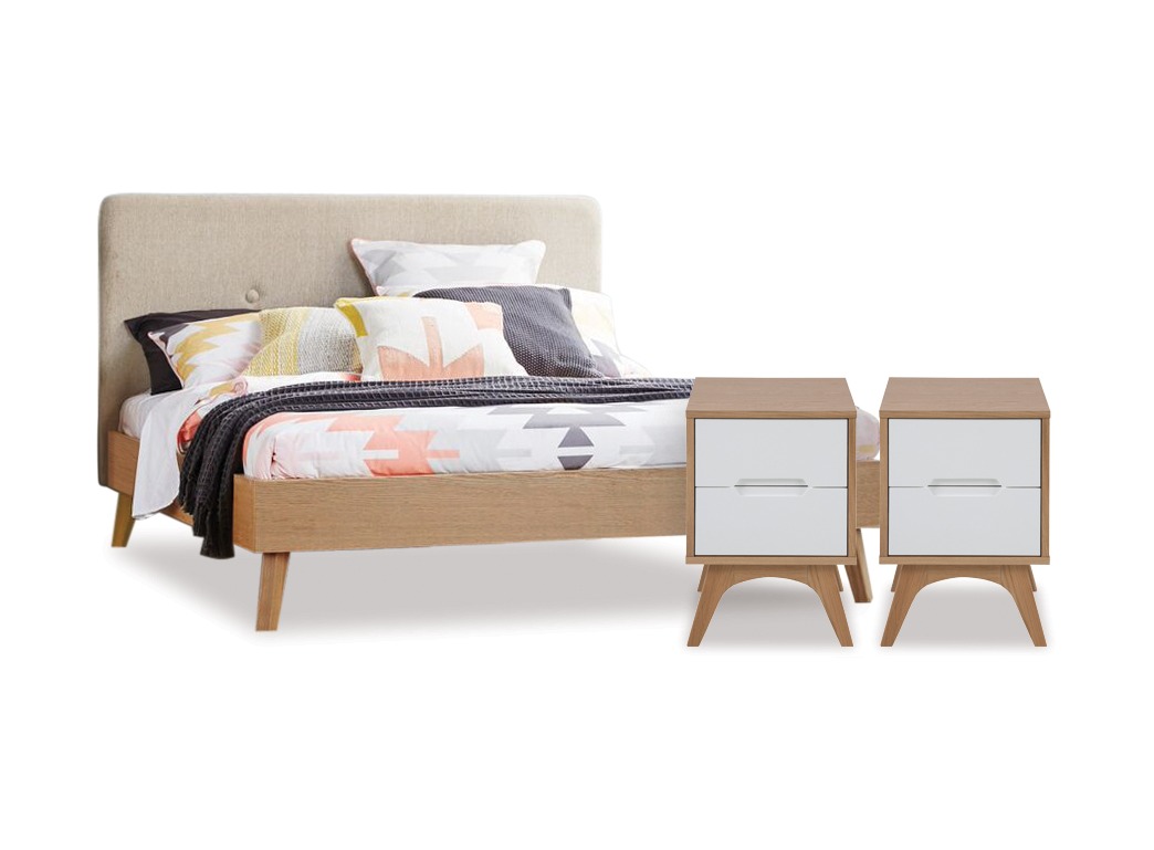 Stylish and contemporary, the Copenhagen bedroom suite offers great design and value. The Copenhagen slat bed in solid and veneer oak features an upholstered headboard in Dallas sand fabric complemented by the bedside tables in oak veneer with white lacquer drawer fronts. The Copenhagen bedroom suite will make an eye-catching addition to your bedroom.